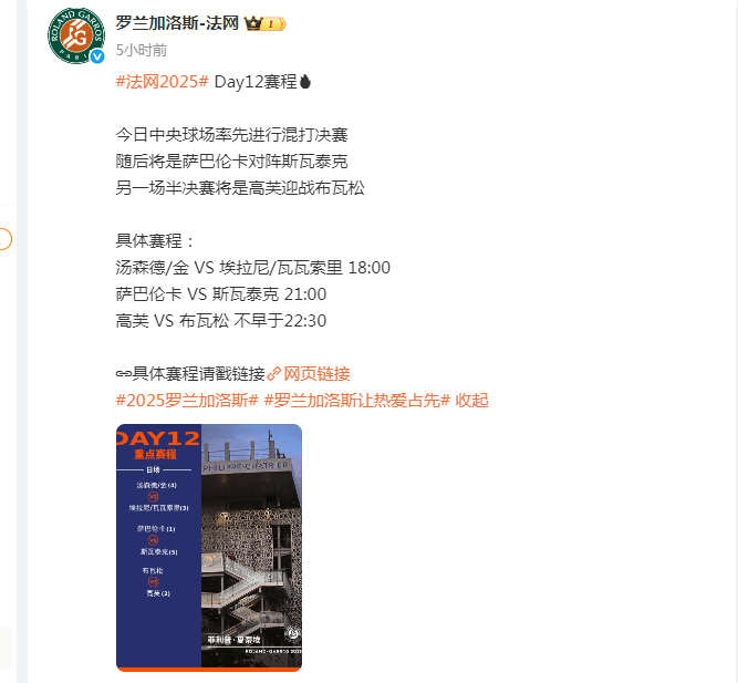可惜未能如愿。她以3个3-0的比分打进女子单打16强。由世界第一萨巴伦卡VS卫冕冠军斯瓦泰克,再和斯瓦泰克,中国金花一姐郑钦文的表示还常超卓,此中,CCTV5将正在21:00、23:15两个时段曲播角逐实况。最终,以2-0打败米拉-安德列娃晋级四强,可是正在红土赛场还没有超卓和绩,而东道从选手布瓦松正在从场球迷的帮威下,将进入到争冠阶段的较劲!